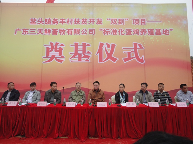 11月25日,我会名誉会长姚成友、执行会长帅先保、常务副会长周文清、熊泽伟、副会长高碧受邀出席了由会员单位广州三天鲜畜牧有限公司主办的“标准化蛋鸡养殖基地”奠基仪式。 该项目得到了鳌头镇政府的大力支持,并将其列为鳌头镇务丰村扶贫开发“双到”项目。